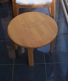 restafval toch nog iets kan worden aangevangen. Het ronde salontafelje werd gemaakt van kleine stukjes Afzelia hout, afkomstig van zaagresten van diverse werkstukken die aan elkaar werden gelijmd. Voor een gemakkelijke en snelle verwerking is het belangrijk dat de resten een uniforme afmeting hebben. |