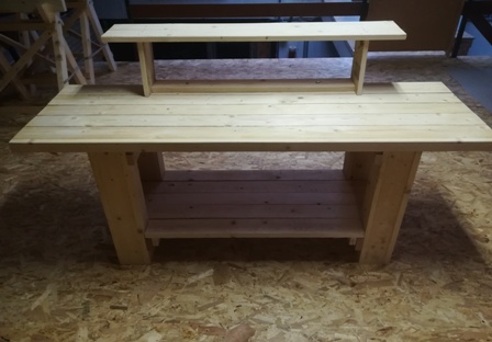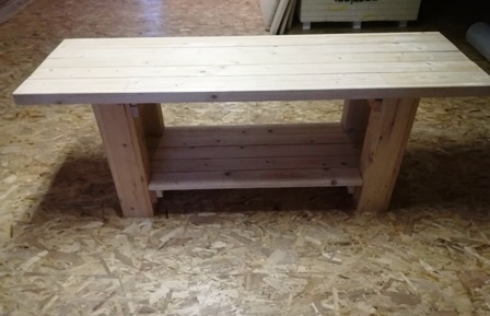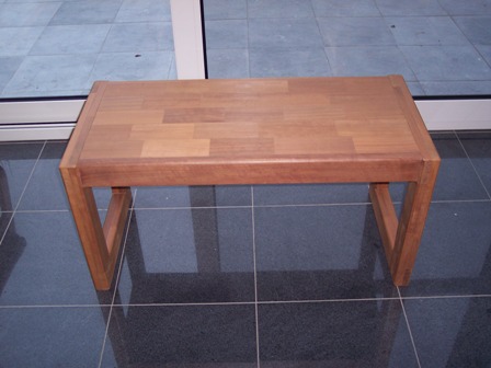 Nog een voorbeeld van hoe met kleine stukjes houtafval toch nog iets nuttig kan worden gemaakt. Een rechthoekig tafeltje. In dit geval werd Sipo hout gebruikt. Dit is "iets" creëren met stukjes van "niets". Een zitbankje of bijzettafeltje... |