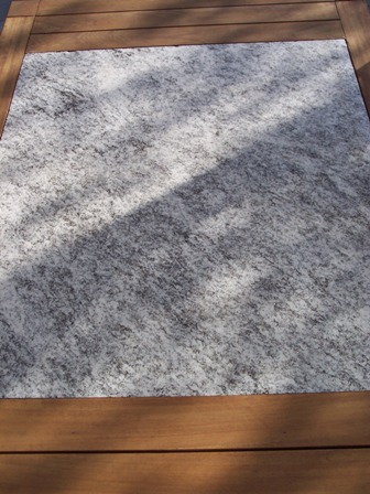 materialen : Granieten natuursteen : Dit blad is afkomstig van de renovatie van de Zuidertoren te Brussel (pensioentoren). Jarenlang deed deze natuursteen dienst als muurbekleding van het onderste gedeelte van de toren. Door de eenvoudige verankering met metalen bevestiging achteraan kon deze steen gemakkelijk en met weinig beschadiging worden verwijderd. Graniet is zeer hard en duurzaam. De dikte is 3 cm. Kortom een zeer kwalitatief topprodukt. Tropisch hout "Bilinga" : Deze balken werden eveneens gerecupereerd. Ze zijn afkomstig van lintelen of lateien van een woning en ondersteunden jarenlang raam- en deuropeningen. Na het schaven kwam de prachtige goudbruine kleur te voorschijn. Bilinga is één van de meest duurzame tropische houtsoorten (duurzaamheidsklasse 1) en kan dus perfect jarenlang aan alle weersomstandigheden weerstaan. |