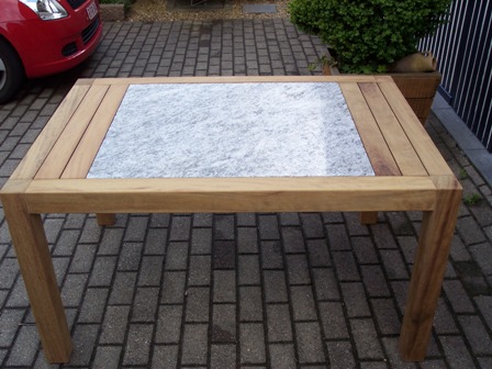 | Deze tuintafel werd volledig vervaardigd uit gerecycleerde